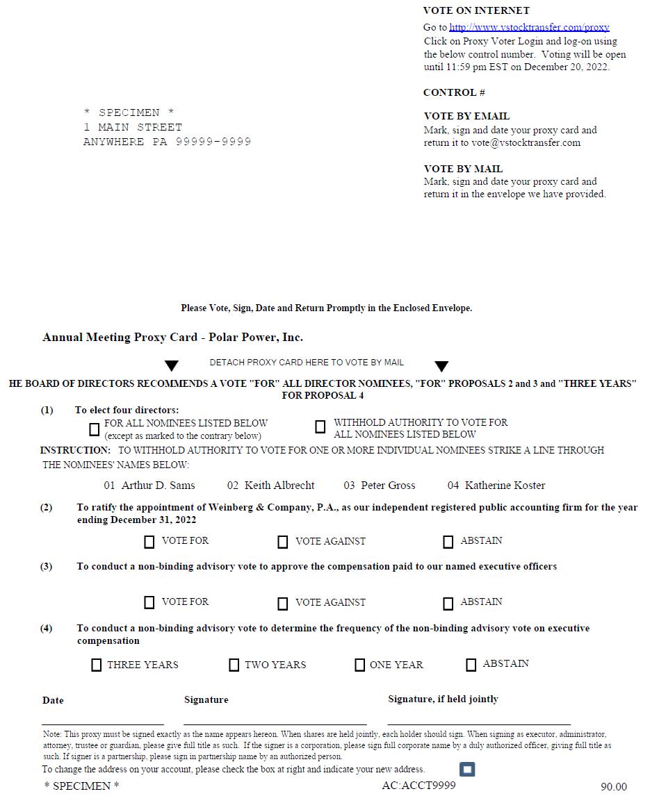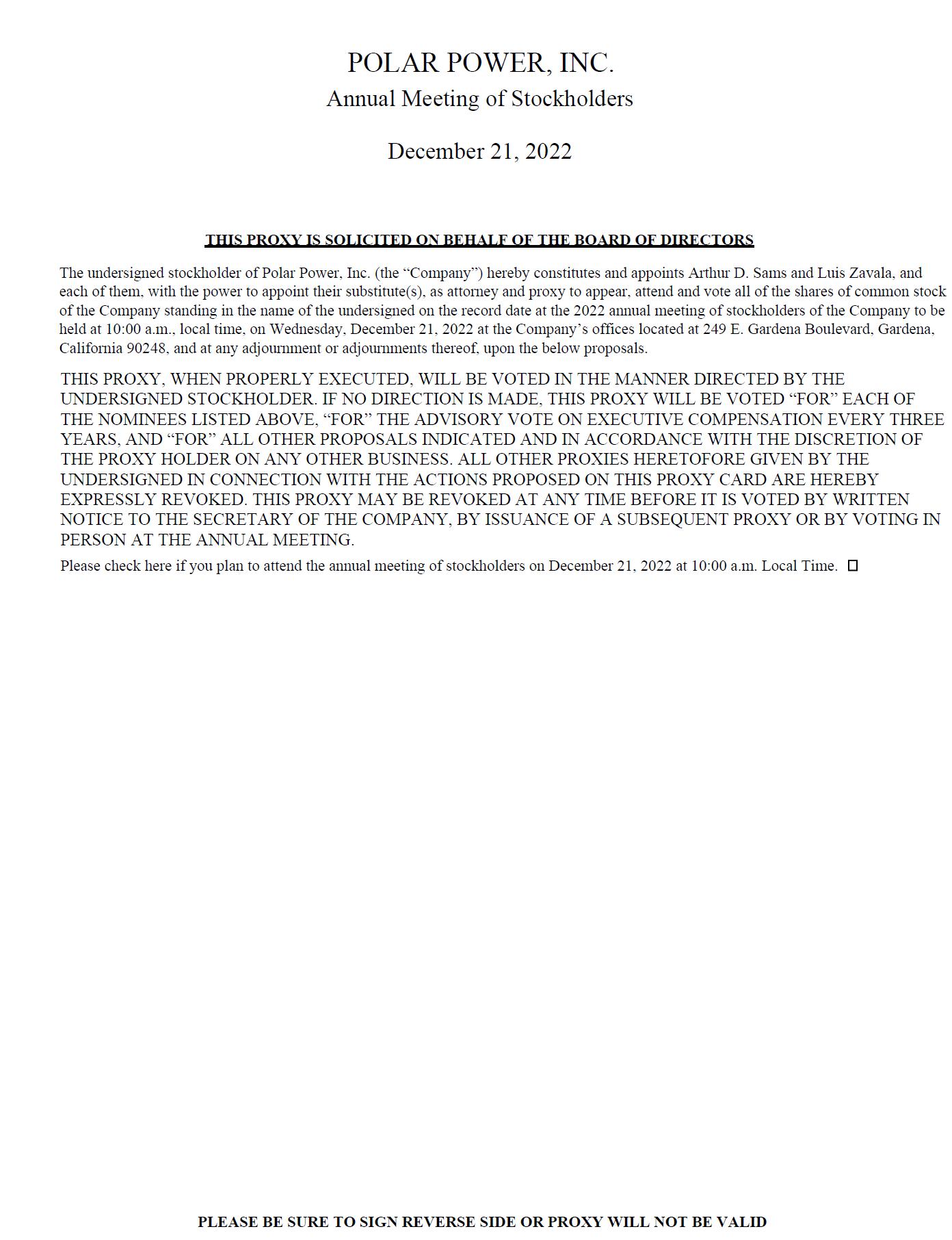 NOTICE IS HEREBY GIVEN that the 2022 annual meeting (“Annual Meeting”) of stockholders of Polar Power, Inc., a Delaware corporation, will be held at 10:00 a.m., local time, on Wednesday, December 21, 2022 at our corporate headquarters at 249 E. Gardena Boulevard, Gardena, California 90248, for the following purposes, as more fully described in the Proxy Statement accompanying this notice: