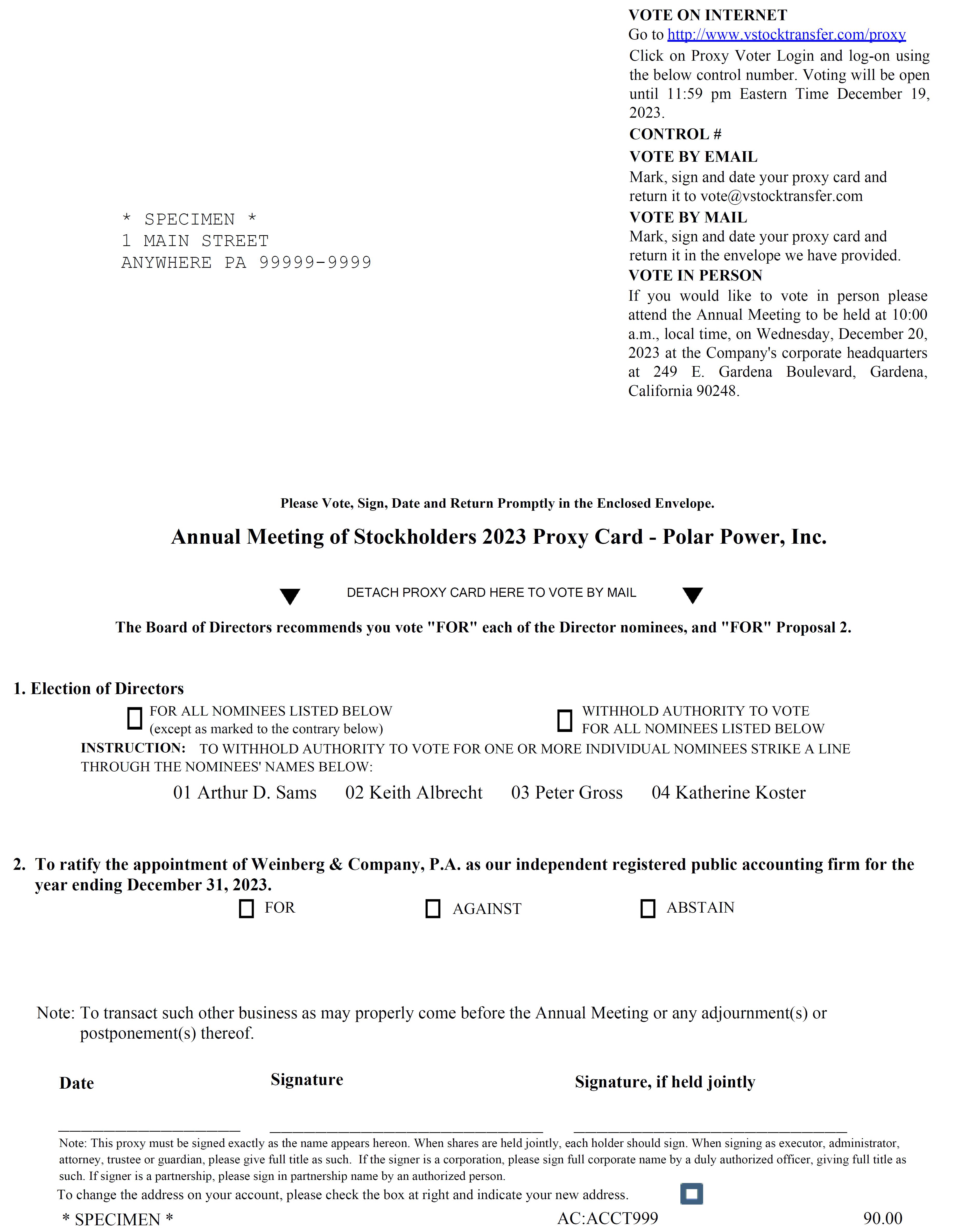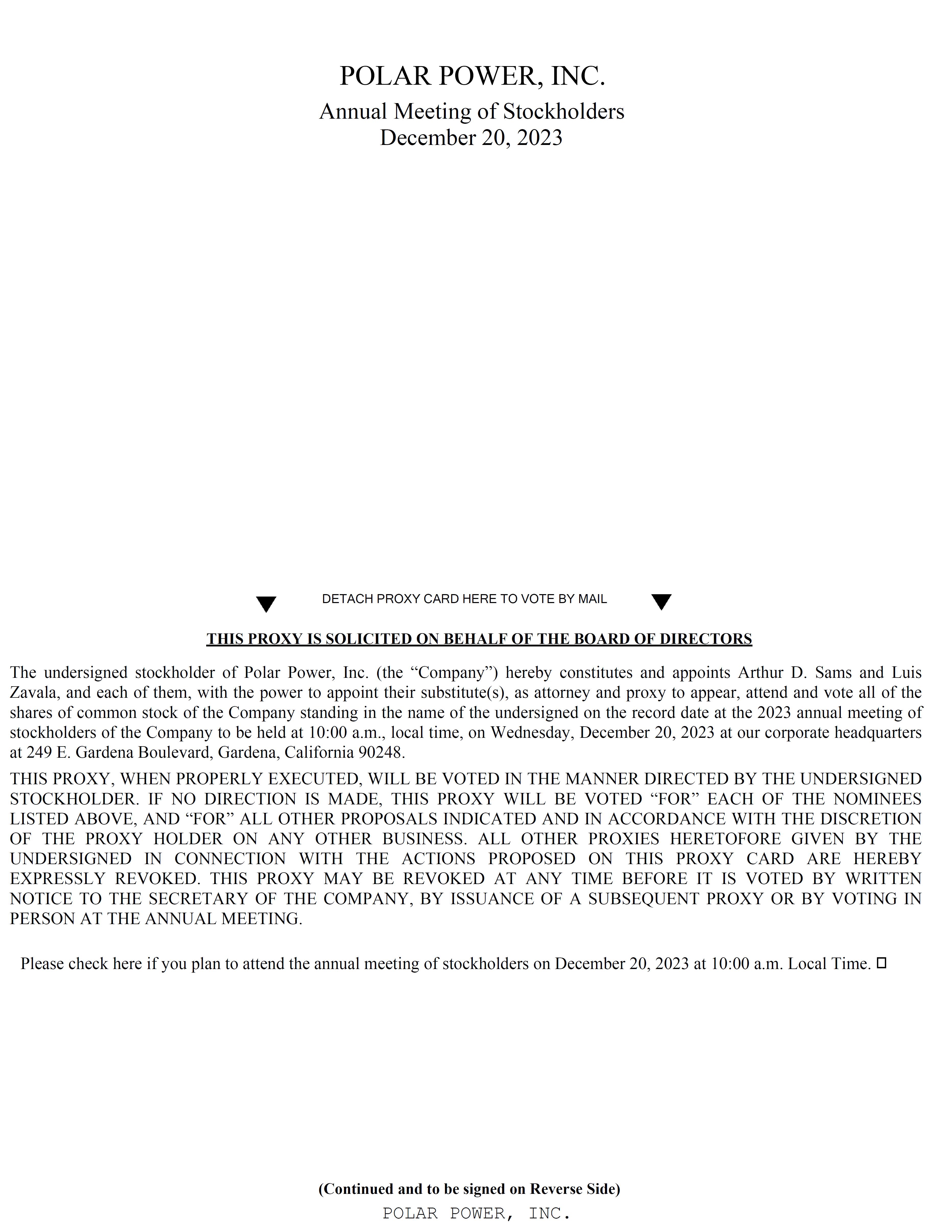 NOTICE IS HEREBY GIVEN that the 2023 annual meeting (“Annual Meeting”) of stockholders of Polar Power, Inc., a Delaware corporation, will be held at 10:00 a.m., local time, on Wednesday, December 20, 2023 at our corporate headquarters at 249 E. Gardena Boulevard, Gardena, California 90248, for the following purposes, as more fully described in the Proxy Statement accompanying this notice:
