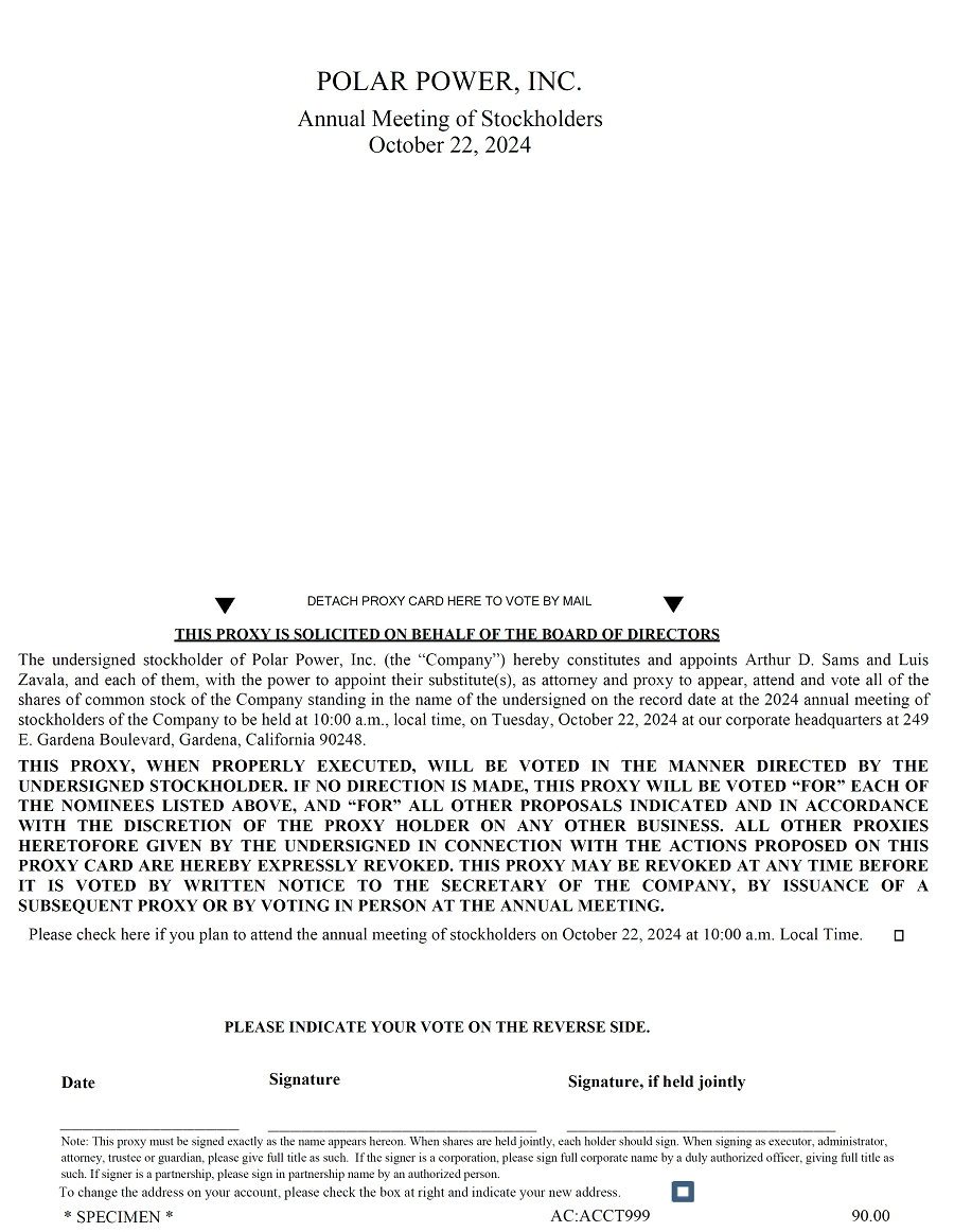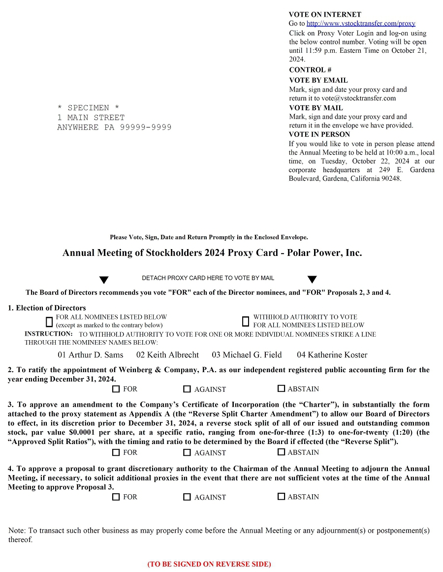 We cordially invite you to attend the 2024 annual meeting (“Annual Meeting”) of stockholders of Polar Power, Inc., which will be held at 10:00 a.m., local time, on Tuesday, October 22, 2024 at our corporate headquarters at 249 E. Gardena Boulevard, Gardena, California 90248. All stockholders of record at the close of business on September 26, 2024 are entitled to vote at the Annual Meeting. The formal meeting notice and Proxy Statement are attached.