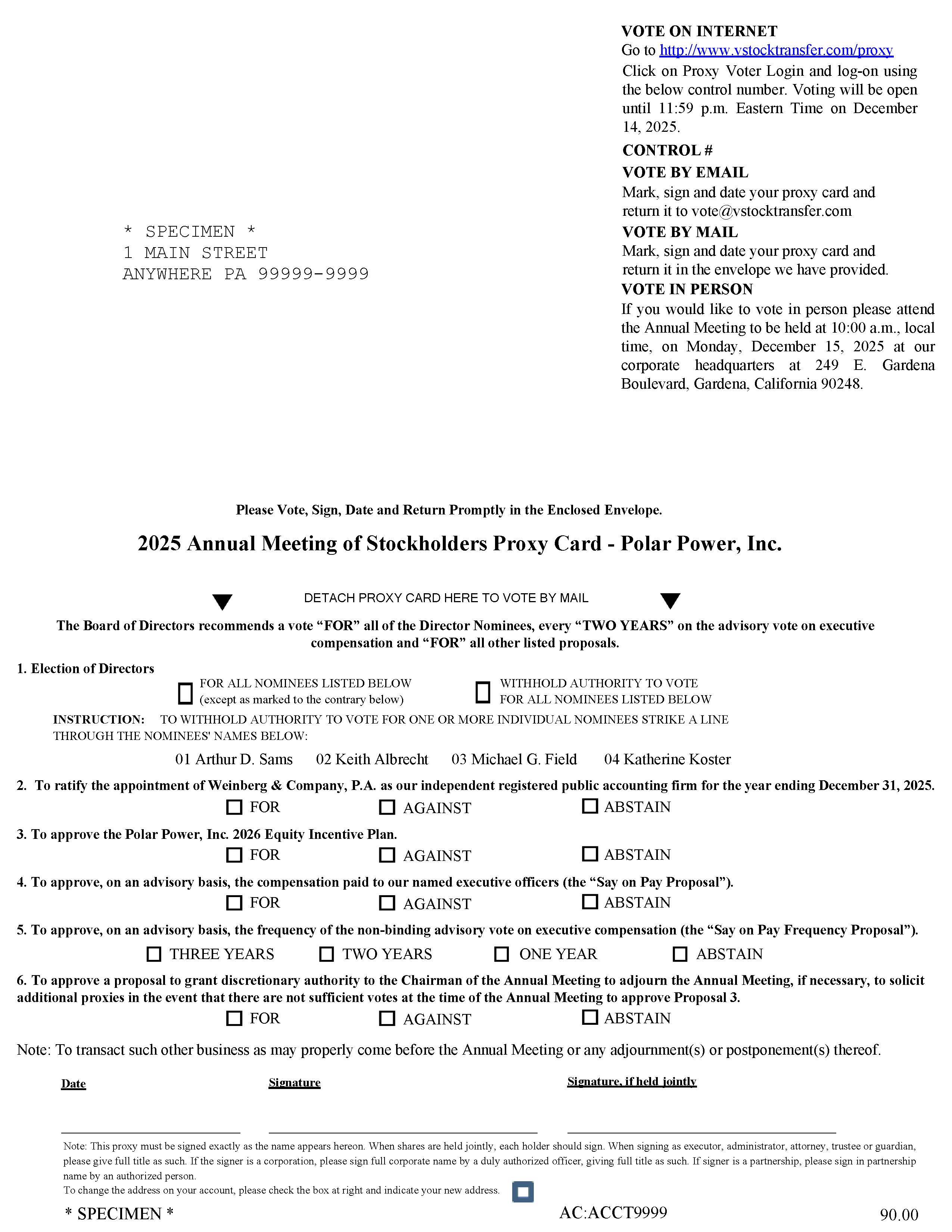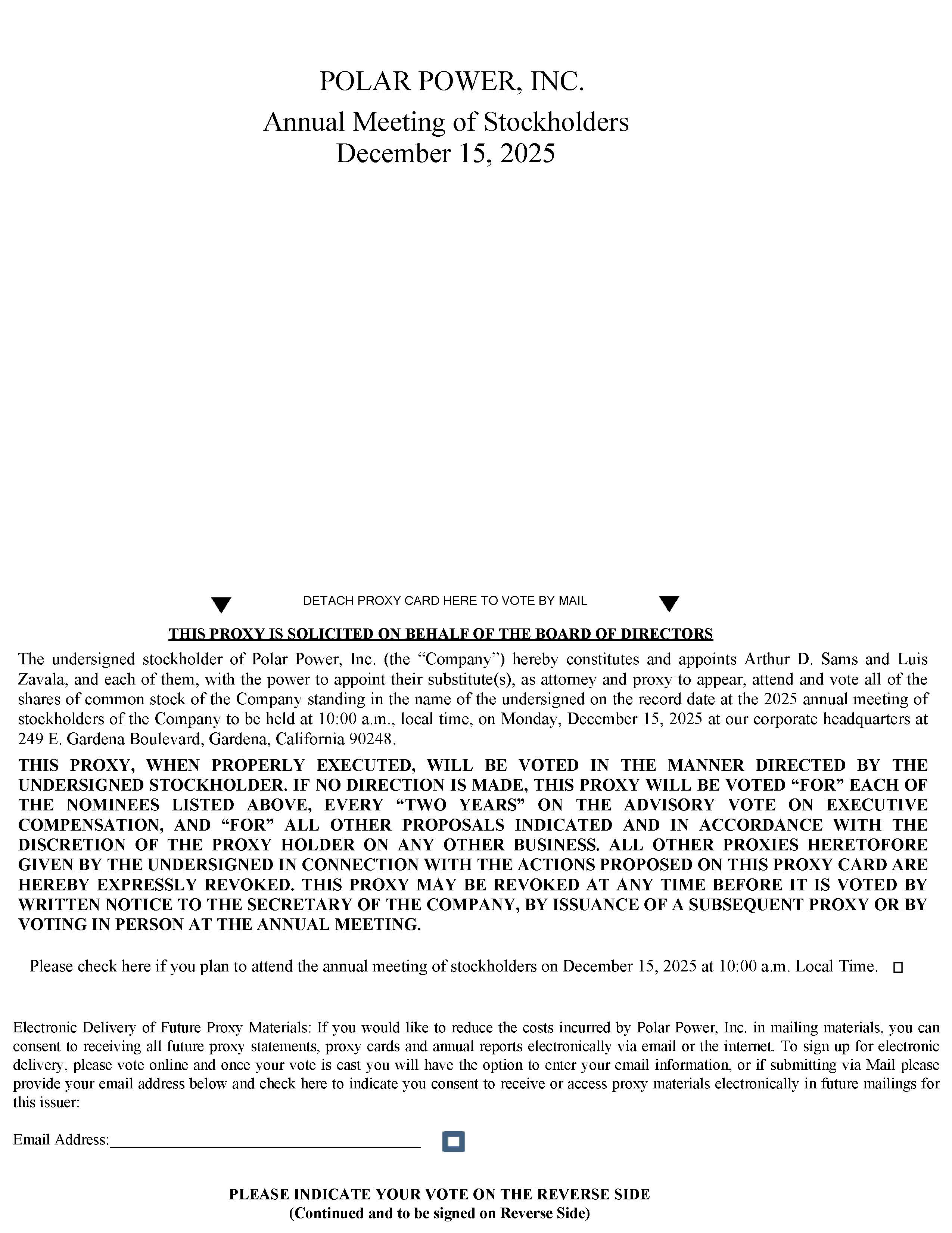 We cordially invite you to attend the 2025 annual meeting (“Annual Meeting”) of stockholders of Polar Power, Inc., which will be held at 10:00 a.m., local time, on Monday, December 15, 2025 at our corporate headquarters at 249 E. Gardena Boulevard, Gardena, California 90248. All stockholders of record at the close of business on November 6, 2025 are entitled to vote at the Annual Meeting. The formal meeting notice and Proxy Statement are attached.